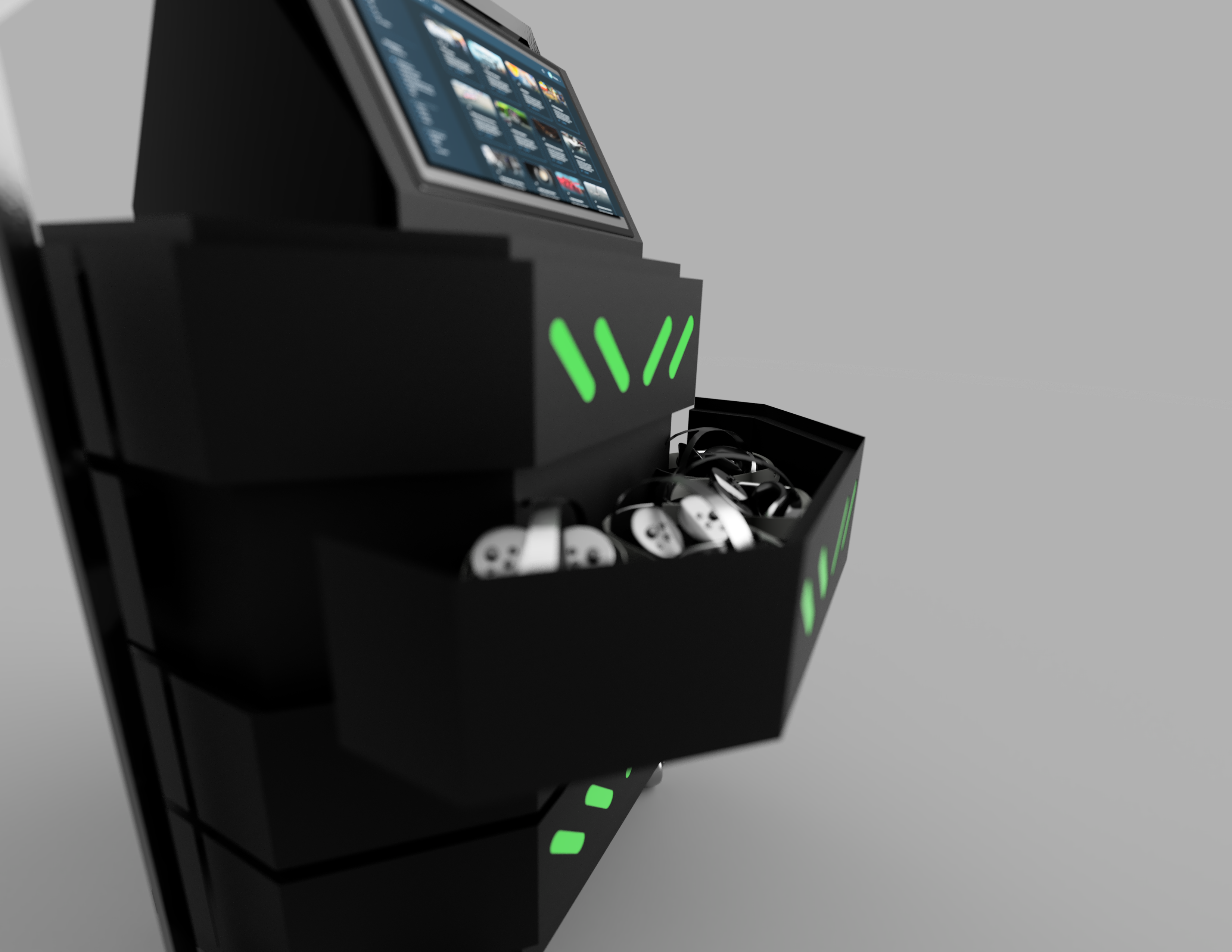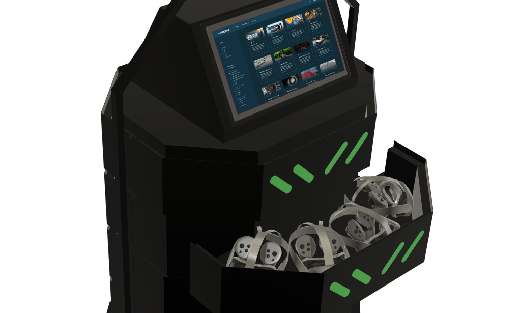 Om geknoei met kabels te voorkomen is het aantal gereduceerd tot 1. Met behulp van een magneet kabel wordt de GoKart geladen waardoor een volledige dag er XR lessen meegegeven kan worden. De headsets worden in de lades draadloos opgeladen.